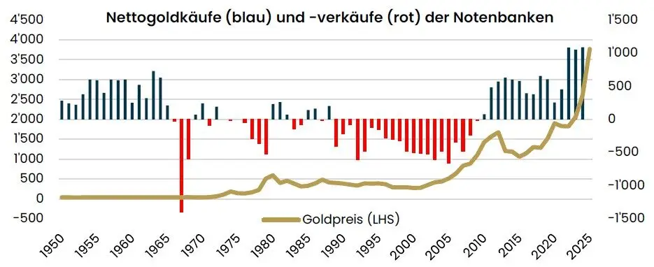Besonders markant ist der Rückenwind durch Zentralbanken. Das Einfrieren russischer Vermögenswerte im Jahr 2022 als Reaktion auf den Einmarsch in die Ukraine dürfte ein Warnsignal für autoritäre Staaten gewesen sein. Infolge-dessen bauen die Zentralbanken ihre Goldbestände aus, um ihre Dollarreserven zu diversifizieren. Entsprechend sind Zentralbankkäufe ein zentraler Pfeiler der Nachfrage. Diese liegen mit über 1‘000 Tonnen pro Jahr seit 2021 doppelt so hoch wie im Durchschnitt des vorherigen Jahrzehnts (vgl. Abb.). Zu den aktivsten Goldkäufern zählen China und Russland, welche damit ein starkes Zeichen gegen das westliche Währungssystem setzen (Ent-Dollarisierung). Auch Privat-investoren zeigen Interesse: Gold-ETFs verzeichnen im 1. Halbjahr 2025 die höchsten Zuflüsse seit 2010.
